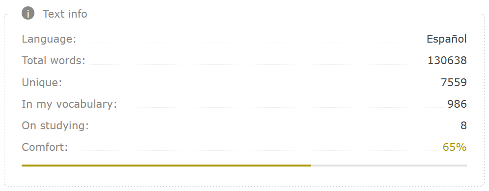 After each change, the service calculates the "Comfort" indicator (the percentage of text comprehension based on all the words in your vocabulary).